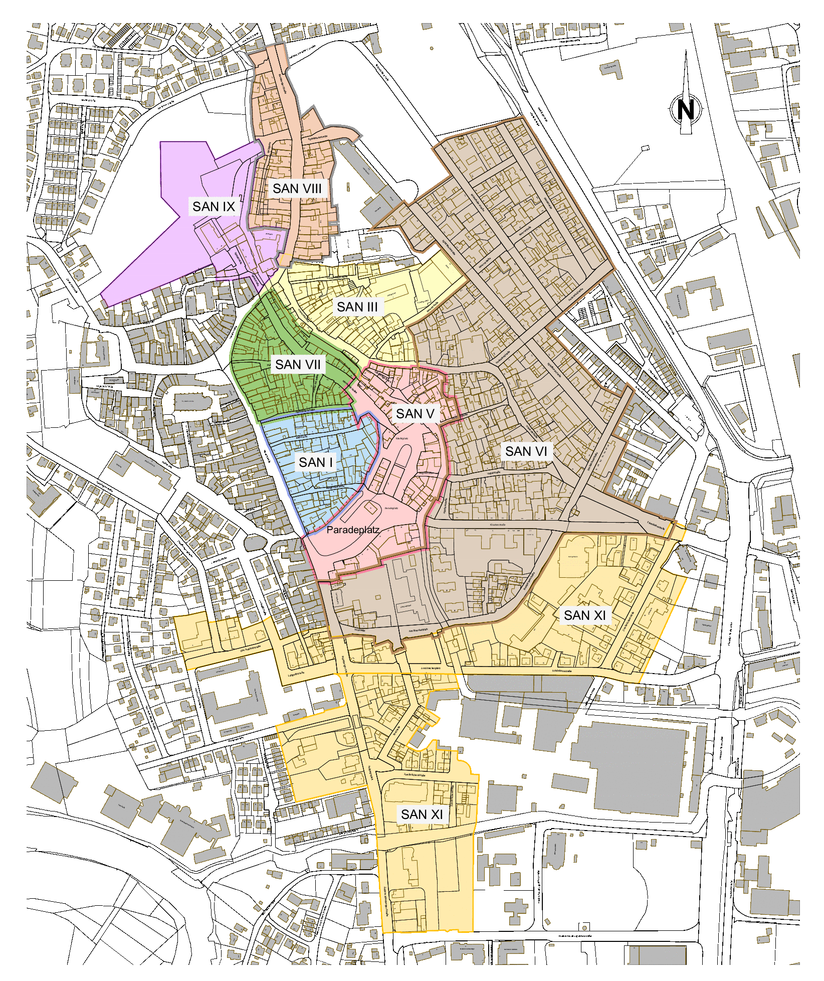 Gültig für die Sanierungsgebiete im Stadtkern (SAN I, III, V, VI, VII, VIII, IX, XI).
