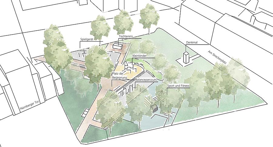 Der Streckerplatz wird zukünftig folgende Bereiche anbieten: In der Mitte unter den Bäumen entstehen Verweilzonen für Begegnungen und Entspannung. Im Norden der Grünanlage entsteht eine Kombinationsanlage, auf der Kinder von drei bis 14 Jahren ihre Sinne und Fähigkeiten trainieren können. Die bereits vorhandene Tischtennisplatte wird in den Spielbereich integriert. Daneben können Kleinkinder im eigenen Bereich spielen. Dort sind sie von der Straße abgegrenzt und können sich im Blickfeld der Eltern ungestört bewegen.