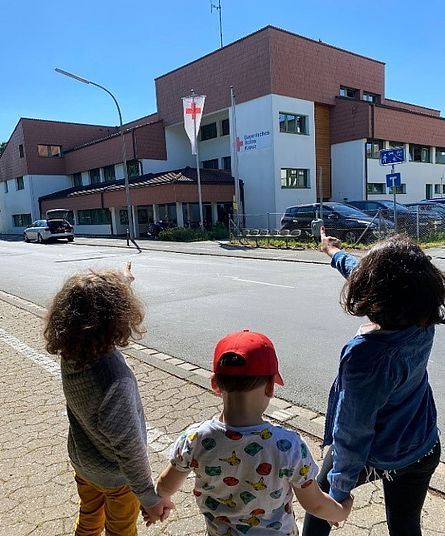Direkt angrenzend am Gebäude befindet sich ein Parkplatz, der von den Eltern in den Bring- und Abholzeiten, sowie vom KiTa-Team genutzt wird. Im näheren Umfeld der Einrichtung sind mehrere Spielplätze, unter anderem auch der Spielplatz für den Kindergarten an der Stadtmauer. Der Stadtpark, E-Center, als auch die Innenstadt sind zudem in wenigen Minuten zu Fuß erreichbar und laden zu Spaziergängen und Ausflügen mit den Kindern ein. Durch die Lage der Einrichtung, direkt an der Hauptstraße, erlernen die Kinder zügig den Umgang und das Verhalten im Straßenverkehr, als auch ihren Sozialraum zu nutzen.