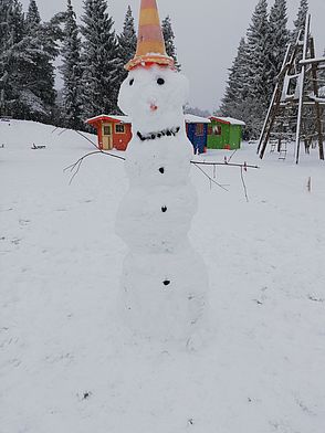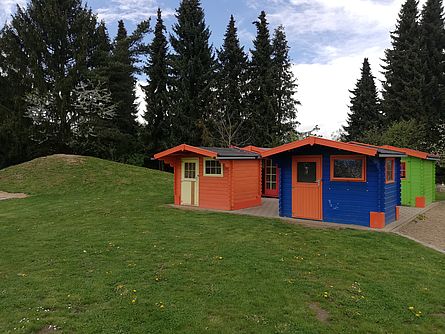 In unserem Hortdorf, welches aus sechs Blockhüttchen besteht, können die Kinder ebenfalls miteinander spielen, sich zurückziehen und in Rollenspielen ausprobieren.