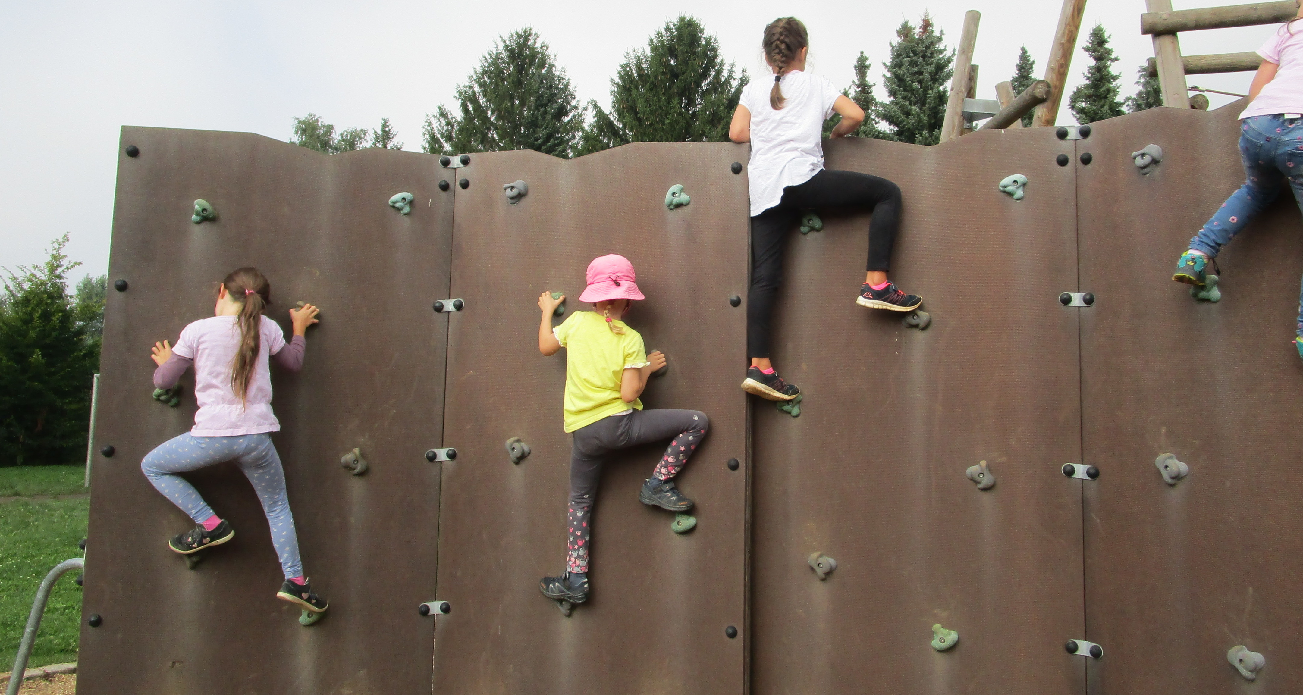 Die Königinnenschaukel, der Seilgarten, ein Fußballplatz, ein Basketballkorb, ein kleiner Berg, ein großer Sandkasten mit Wasserpumpe, ein Bodentrampolin, ein Balancierbalken und eine Kletterwand laden zum Bewegen, Spielen, Toben und Hüpfen ein. Auf unserer Terrasse fahren die Kinder gerne Inliner, springen Seil oder malen mit Straßenkreide.