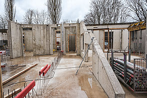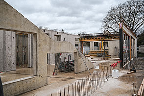 Mit einem Außenmaß von rund 41m x41m fügen sich zwei ineinander verschränkte Hexagone zu einem zweigeschossigen Baukörper zusammen und geben dem siebengruppigen Kinderhaus seine ganz besondere Form. Der Hybridbau adaptiert dabei eine natürliche Bienenwabenstruktur. Die Dachflächen werden extensiv begrünt und im Süden mit einer PV-Anlage ausgestattet. Der Massivbau erhält eine Außenwandverkleidung aus Holz. Im Südwesten des Grundstückes stehen großflächige Freianlagen mit Spielgeräten für die Kinder zur Verfügung.