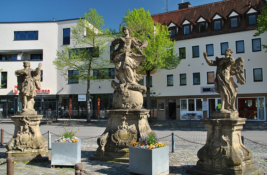 Auf dem Paradeplatz erweckt eine Marienfigur, der zwei Engel zur Seite gestellt sind, die Aufmerksamkeit der Besucher. Diese Figurengruppe, die stets ihr Augenmerk auf das rege Treiben auf dem vor ihr liegenden Platz gerichtet hat, ist vermutlich ein Werk von Georg Reuß aus dem Jahr 1747.