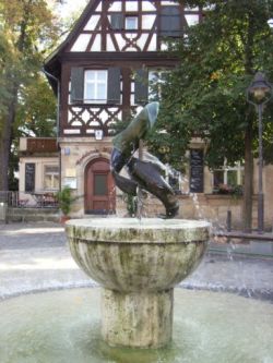 In der gärtnerischen Anlage an der Klosterstraße steht der Fischerbub des Forchheimer Bildhauers Georg Leisgang. In beiden Händen hält der Fischerbub jeweils eine Forelle, aus der Wasser sprudelt.