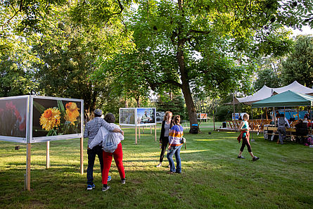 Das KulturSommerQuartier 2024 bot aber nicht nur Musik! Der Stadt Triathlon Forchheim nutzte das Gelände für den Zieleinlauf. Zum Büchereifest, das mit seinem großen Medienflohmarkt viele Schnäppchenjäger*innen anlockte, konnte auf der Bühne die Aufzeichnung des Podcast „Eisenbart & Meisendraht – Das Magazin für Eigenart“ live verfolgt werden. Auch ein Ensemble des „Fränkischen Theatersommers“ gastierte Ende Juni mit dem Stück „Nathan der Weise“ im KulturSommerQuartier. Das grüne, parkähnliche Areal wurde in diesem Jahr noch durch eine Foto-Ausstellung des Vereins „FoFoFo – FotoForumForchheim“ aufgewertet. Auch wenn die Vernissage am 31. Mai 2024 im Dauerregen stattfinden musste, fanden viele neugieren und fotobegeisterte Besucher*innen den Weg ins KulturSommerQuartier. Die großformatigen Bilder der Ausstellung, die während der gesamten Saison zu sehen waren, luden zum Schlendern und Entdecken im Quartier ein und steigerten schon die Vorfreude auf den FOTOPARK FORCHHEIM, der vom 6. September bis 20. Oktober 2024 den Stadtpark und die Innenstadt in eine große Outdoor-Ausstellungsfläche verwandelte.
