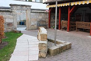 Nebenräumlichkeiten: Küche, Innenhof mit Biertischgarnituren