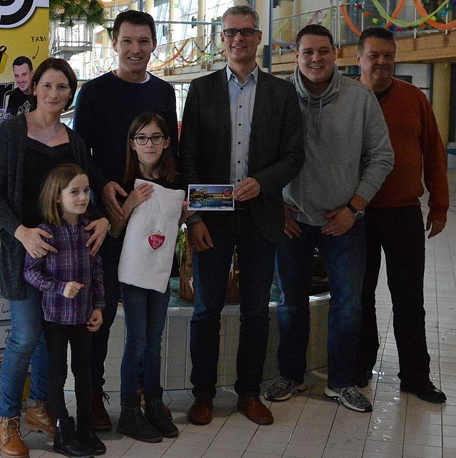 Der glückliche Tagesgewinner, Marko Pfister aus Willersdorf, Gemeinde Hallerndorf (3. v. links) kam mit seiner Frau und seinen zwei Töchtern zur Gewinn-Übergabe ins Königsbad. Hier überreichte Oberbürgermeister Dr. Uwe Kirschstein (3. v. rechts) nun den Gutschein im Wert von 600 Euro. Viel Spaß beim Schwimmen wünschten Radiomoderator Christopher Fleith (2. v. rechts) und der Referatsleiter des städtischen Bau-, Grün- und Bäderbetriebes, Walter Mirschberger.