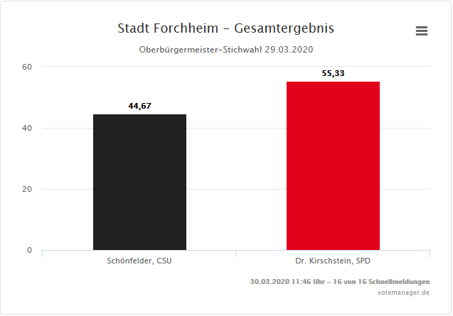 Kirschstein dankte ausdrücklich allen Wahlhelfer*innen und richtete sich mit folgenden Worten an seine Wähler*innen: "Vielen herzlichen Dank für das in mich gesetzte Vertrauen! Ich freue mich riesig über dieses Ergebnis und zugleich den Auftrag, unsere schöne Stadt in den nächsten 6 Jahren gestalten zu dürfen. Mein Dank gilt auch meinem Mitbewerber und meiner Mitbewerberin für den fairen Wahlkampf. Gemeinsam wollen wir Forchheim weiterentwickeln."