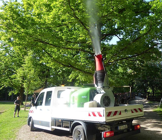 Die Eichen wurden bereits im Vorfeld auf den Befall des Schmetterlings stichpunktartig mit der Arbeitsbühne kontrolliert. Behandelt werden nur die Bäume, die schon im vergangenen Jahr befallen waren, mit einem für Mensch und Tier ungefährlichen Biozid.