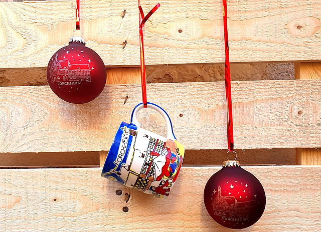 Die qualitativ hochwertigen Kugeln können nur direkt in der Tourist-Information zu einem Preis in Höhe von jeweils 6,00 Euro erworben werden. Ein weiteres Weihnachtssouvenir im Sortiment ist die Forchheim-Tasse „Mila“ in ansprechendem weihnachtlichem Design. Mit feinen Details und froher Farbenpracht wird das Weihnachtsmarktgeschehen vor dem Rathaus auf der Tasse dargestellt. Die Tasse ist in der Tourist-Information für 11,95 Euro zu erhalten.