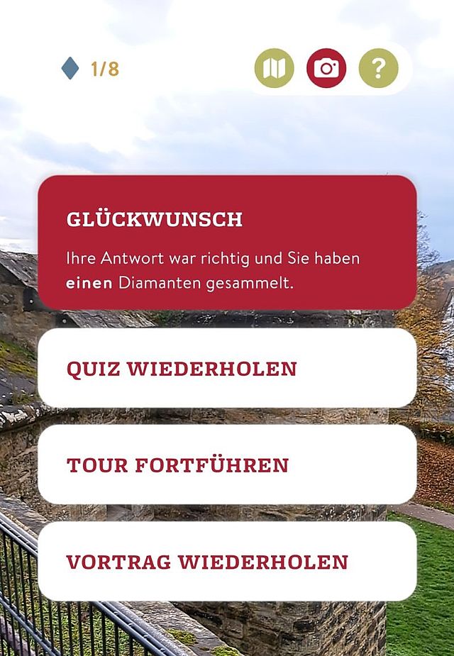 Um die Geschichte spielerischer zu gestalten und somit die Zielgruppe Familien und Schulklassen einzubinden, muss am Ende jedes einzelnen Dialogs eine Quizfragebeantwortet werden. Werden alle Quizfragen richtig beantwortet, gibt es eine Belohnung: ein freier Eintritt ins Pfalzmuseum, der ein Jahr gültig ist.