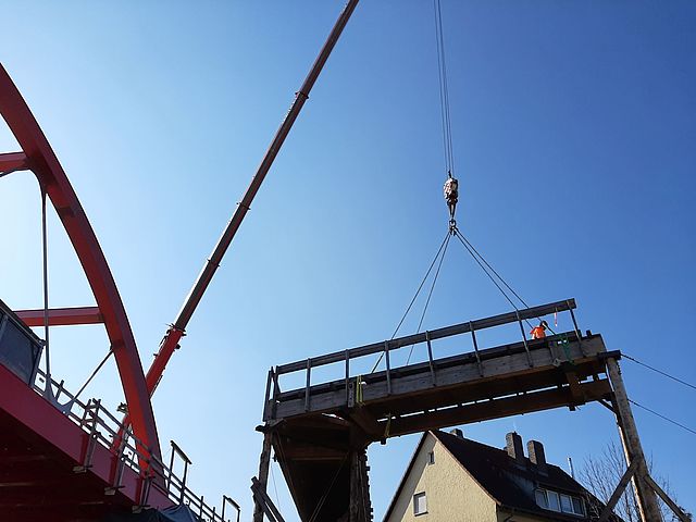 Der Gehweg führt derzeit bereits provisorisch über die neue Stahlbogenbrücke und die Behelfsbrücke wurde rückgebaut (siehe beiliegendes Bild).