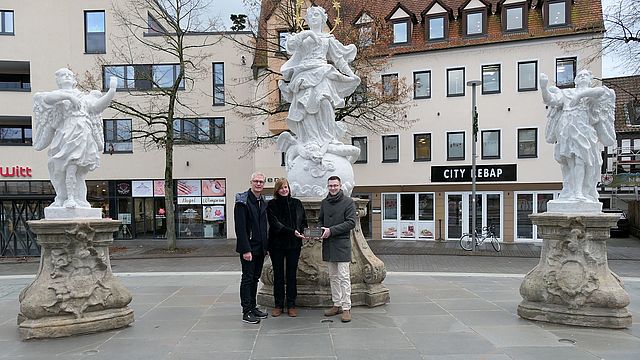 Der Vorsitzende des Heimatvereins Forchheim, Nico Cieslar (rechts) überreicht vor der frisch restaurierten Mariengruppe am Paradeplatz eine kleine Bronzetafel vom Heimatverein, die künftig die Mariengruppe ziert. Diplom-Restauratorin Heike Brinke vom Stadtbauamt und Oberbürgermeister Dr. Uwe Kirschstein freuen sich mit ihm über die gelungene Restaurierung.